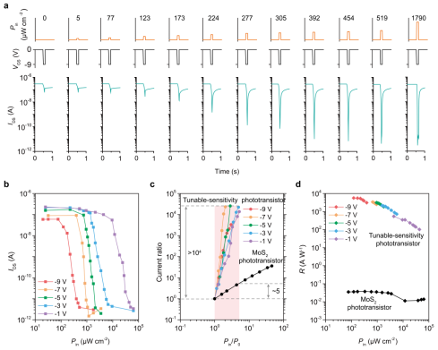 图3.可调灵敏度光电晶体管的光电性能。a 器件在不同光强和不同栅压条件下的光响应行为,表明其光电响应可通过栅压进行有效调控。b 不同栅压下器件电流随入射光强变化的关系,显示出对特定光强区间的增强响应特性。c 可调灵敏度光电晶体管与传统光电晶体管在不同光强条件下的电流变化对比,表明该器件能够放大目标光强变化并抑制无关背景信号。d 可调灵敏度光电晶体管与传统光电晶体管在不同光强条件下的响应度对比,显示其在低光强和低对比度条件下具有显著优势。