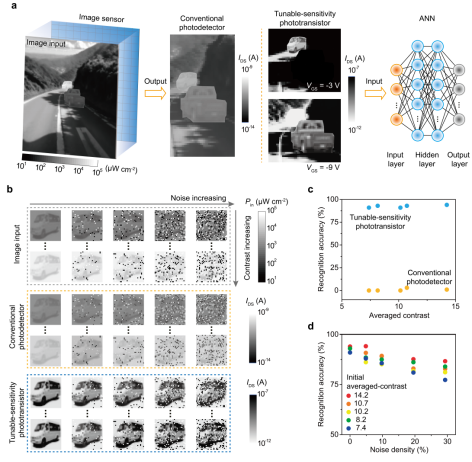 图4.低对比度目标的稳健识别能力。a 集成可调灵敏度光电晶体管阵列的智能机器视觉系统示意图。b 采用传统光电晶体管阵列与可调灵敏度光电晶体管阵列进行成像的对比结果,显示后者在低对比度条件下能够更清晰地突出目标特征。c 在不同平均对比度条件下,可调灵敏度光电晶体管与传统光电晶体管的识别准确率对比,表明前者在复杂光照环境中具有明显优势。d 在椒盐噪声干扰条件下的识别结果对比,显示可调灵敏度光电晶体管在强噪声环境下仍保持较高的识别鲁棒性。