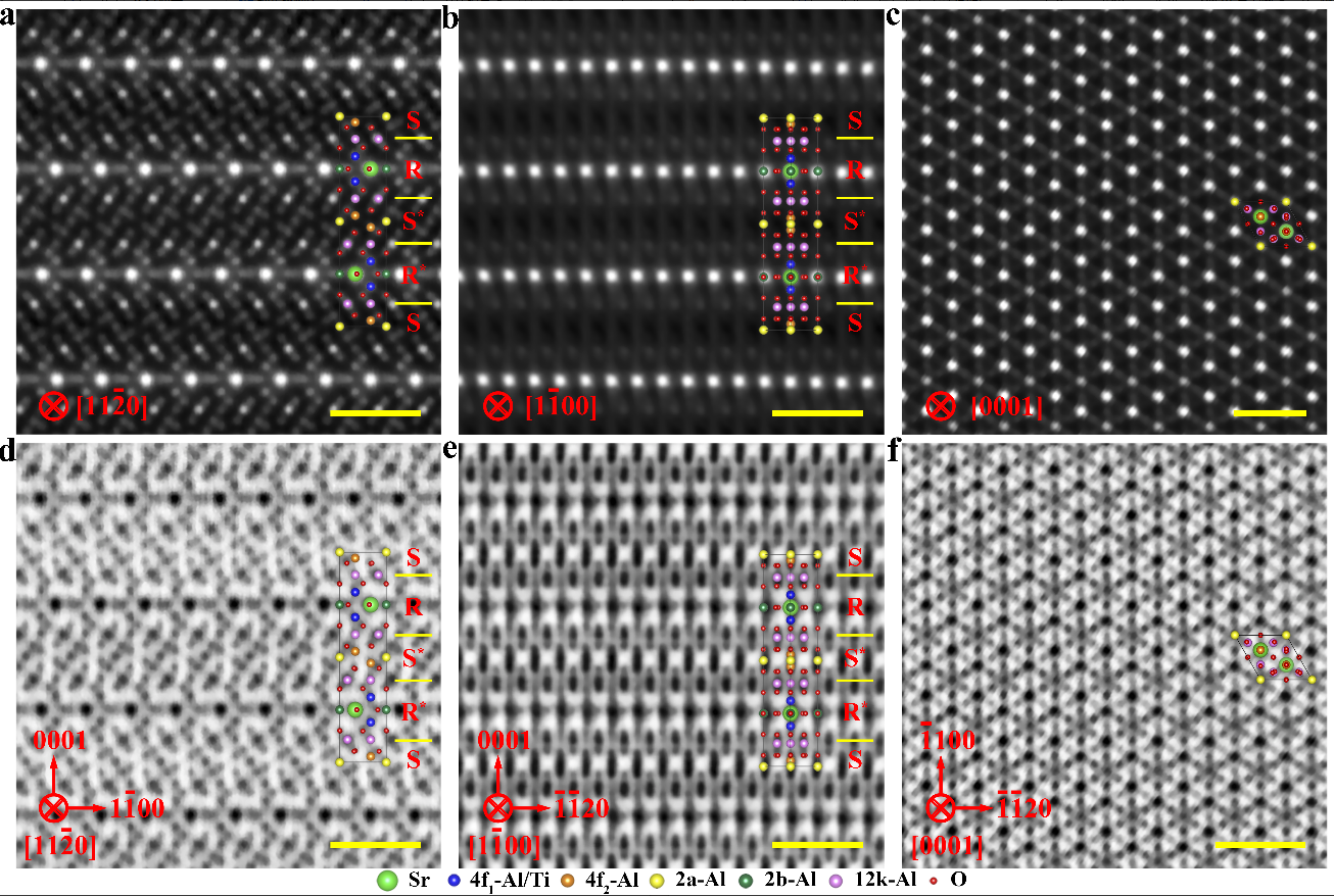 带轴观察的扫描透射电镜HAADF像和(d-f) ABF像。SATO由岩盐块(R)和尖晶石块(S)沿c轴交替排列而成。标尺为1 nm。