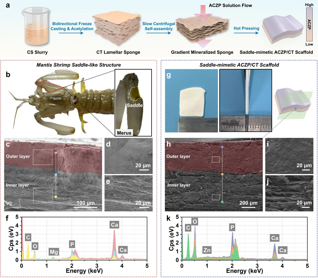 相关结果以“Mantis shrimp saddle-mimetic amorphous calcium (zinc) phosphate/chitin scaffolds with superior mechanical properties and bioactivity for bone regeneration”为题发表于Bioactive Materials 58 (2026) 738–754。