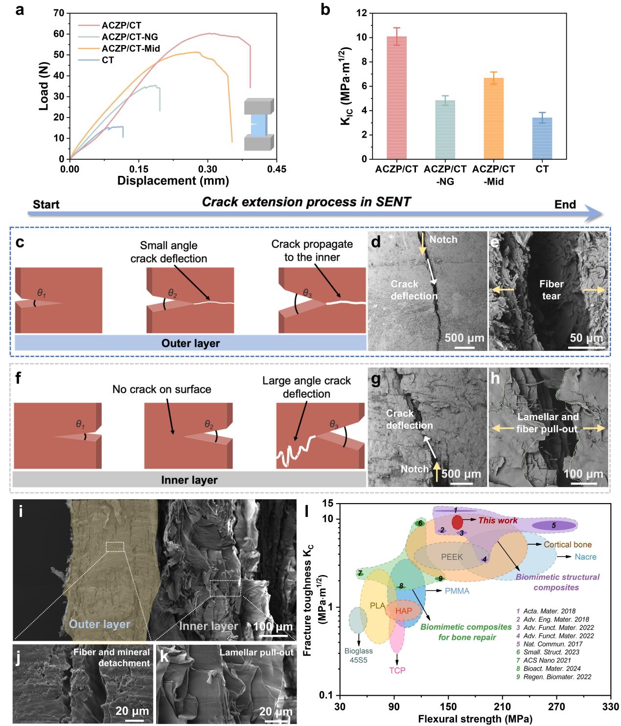 该研究受螳螂虾附肢中“马鞍”外层高矿化、内层富有机相的梯度层状结构启发,以ACZP为核心组装活性单元,通过多级组装策略构建一种集“结构仿生”、“成分仿生”和“功能仿生”于一体的ACZP/几丁质(ACZP/CT)骨修复支架。该支架形成了高矿化致密外层结合有机质层状纤维内层的梯度结构;其中尺寸为1-2 nm的ACZP纳米团簇进一步组装成约250 nm的团聚体。经60℃热压后支架成功保持了非晶相结构;热重分析显示,支架外层矿物含量约为62.02%,内层约为21.39%,体现出明显的梯度矿化特征。在力学性能方面,该仿生支架弯曲强度约为160.09 MPa,断裂韧性最高可达10.08 MPa·m1/2,显示出优异的承载能力,这种优异韧性源于梯度层间复杂裂纹扩展、纤维撕裂、矿物-纤维脱黏以及层间滑移等多重耗能机制的协同作用。在生物学方面,ACZP/CT支架能够通过持续释放的Ca²⁺和Zn²⁺协同激活PI3K-Akt、MAPK和HIF-1等关键信号通路,从而显著促进成骨细胞分化、内皮细胞血管化及成骨耦合。此外,动物实验步证实,该支架在大鼠颅骨缺损模型中表现出优异修复能力,植入6个月后新生骨体积分数达到68.39%,显示出良好的骨再生效果。由此,这种基于ACZP金属离子团簇作为组装单元构建的“结构-成分-功能”仿生骨修复支架,兼具高强度、高韧性与高生物活性,为大尺寸骨缺损修复提供了极具临床转化潜力的崭新策略。
