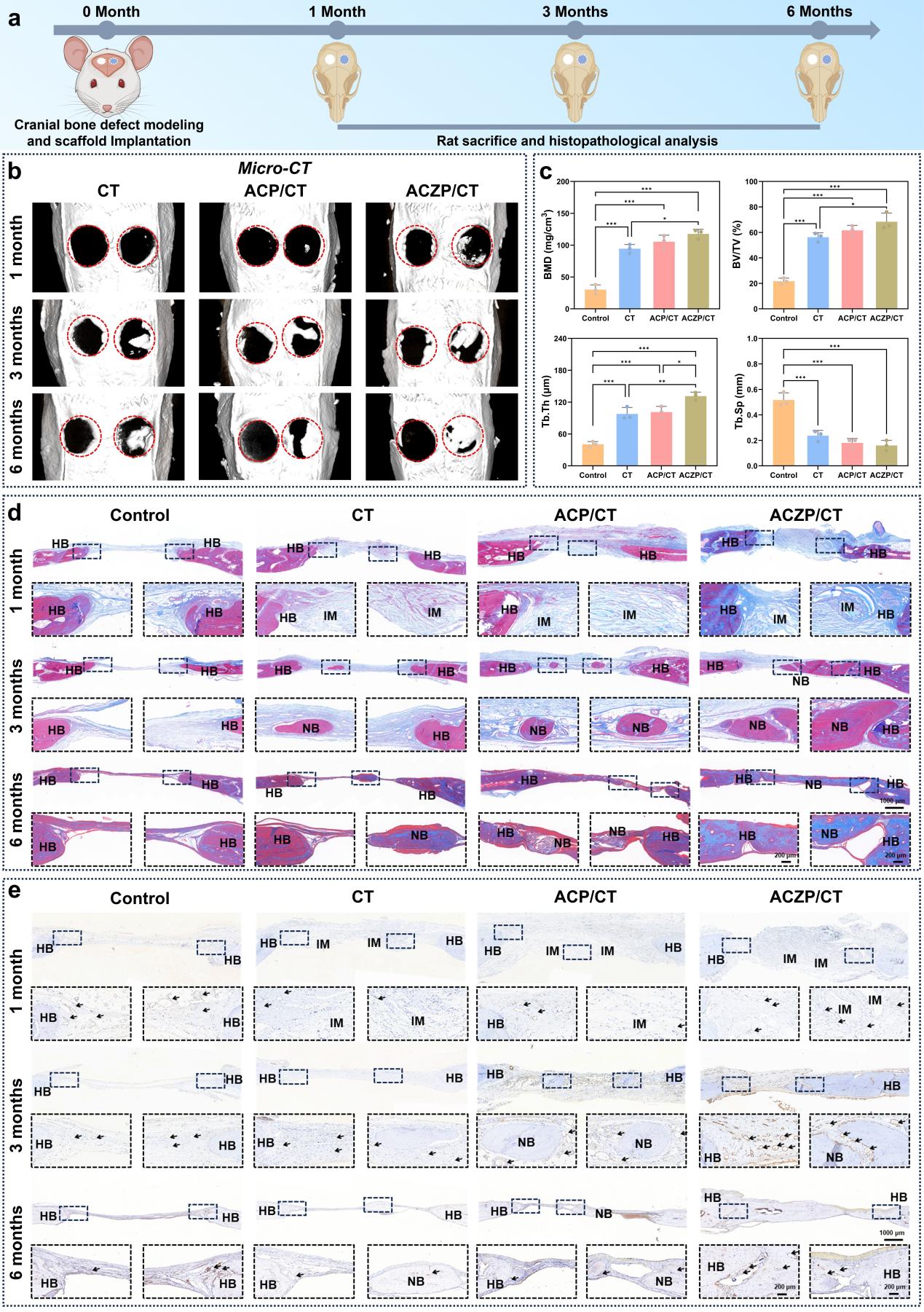 图4 仿生ACZP/CT支架在大鼠颅骨缺损模型中的骨修复效果评价