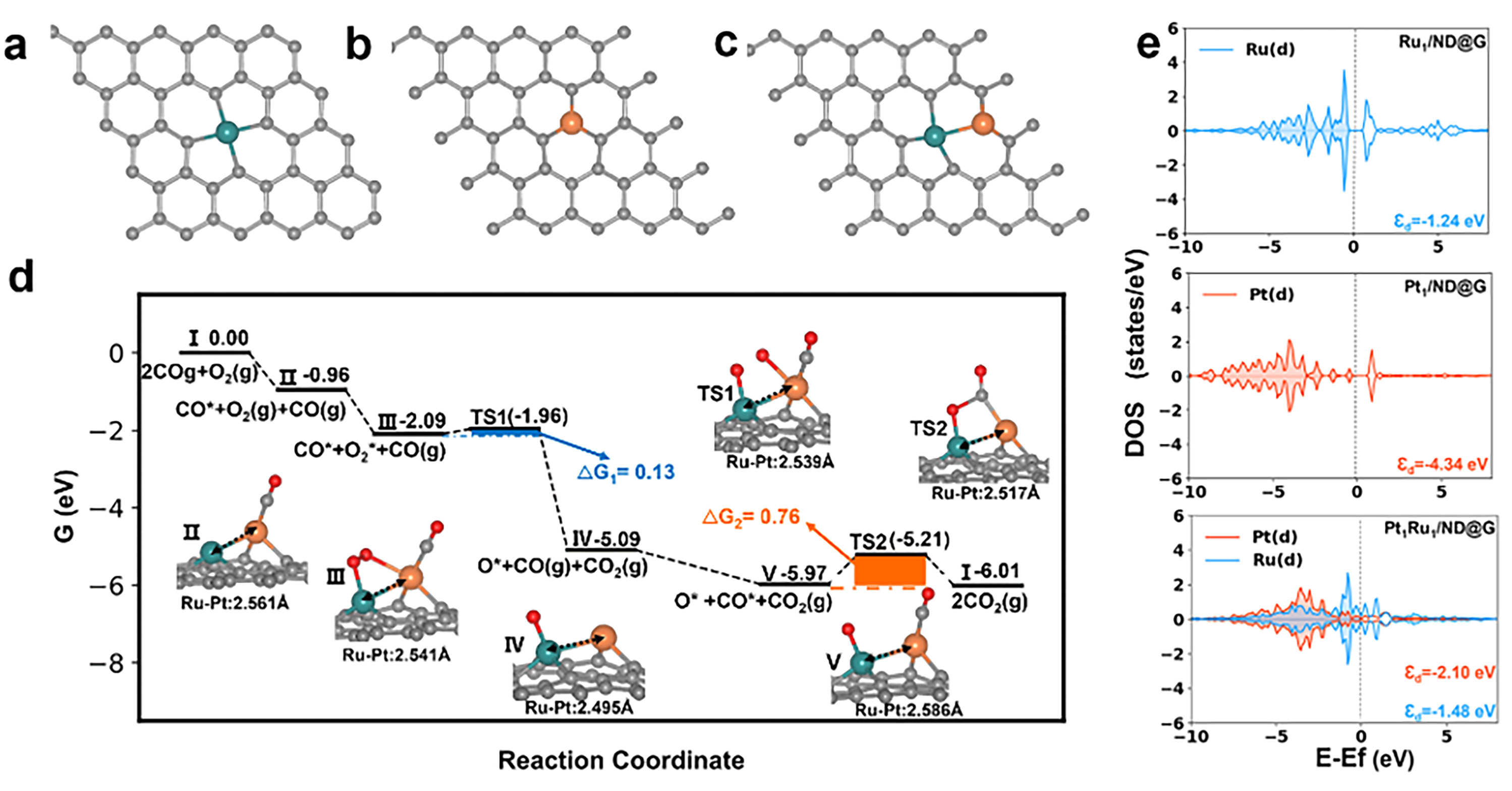 图3. DFT理论计算。(a-c)催化剂结构模型,(d)Pt1Ru1/NDG上CO氧化反应路径,(e)d带中心。