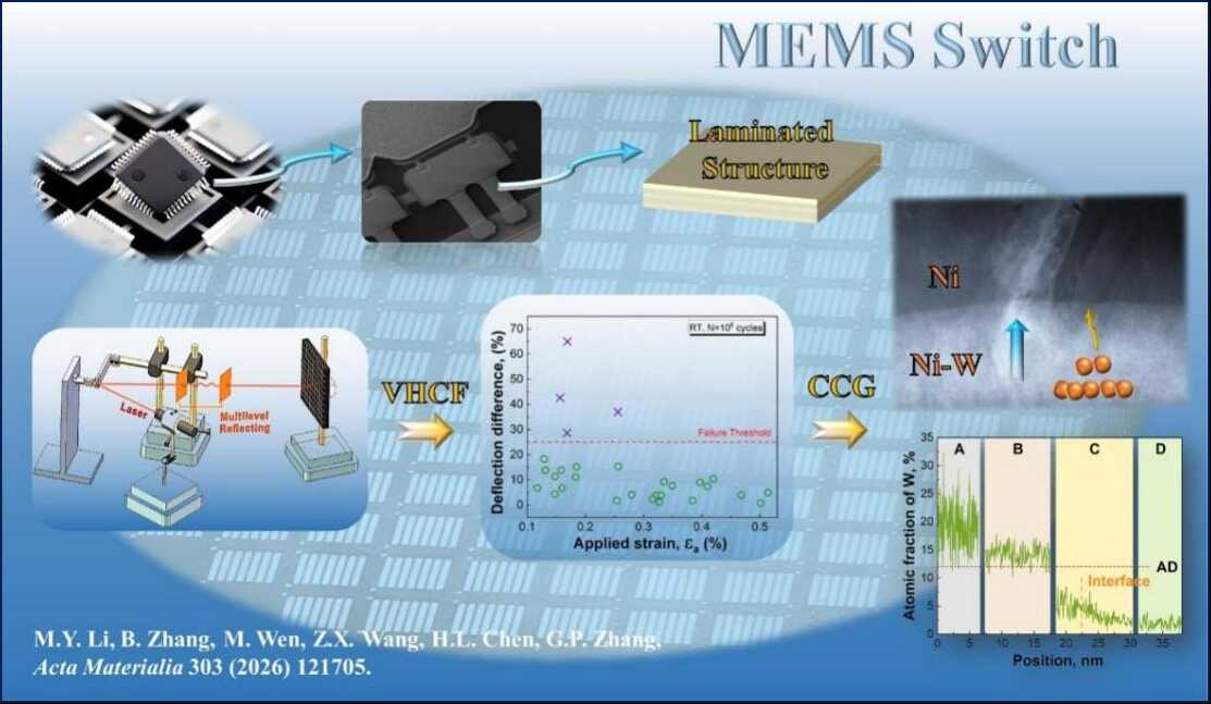 MEMS(微机电系统)开关芯片广泛应用于5G/6G通信、航空航天、工业控制及新能源等领域。作为核心元件之一,其微悬臂梁开关不仅需要具备优异的导电性和高强度,还需在实现"开"与"关"状态切换时承受高达百亿次超高周循环的动态弯曲变形。微悬臂梁材料能否在超高周疲劳载荷下保持高服役可靠性是制造高功率、低功耗高端MEMS开关芯片的关键挑战之一。虽然金及其合金凭借低电阻率和良好的可微加工性被广泛用于微悬臂梁开关,但其较低的拉伸强度和疲劳抗力无法满足超长疲劳寿命的要求。因此,如何发展高性能开关用微悬臂梁金属材料的设计新原理与新技术,已成为业界亟需解决的关键问题之一。