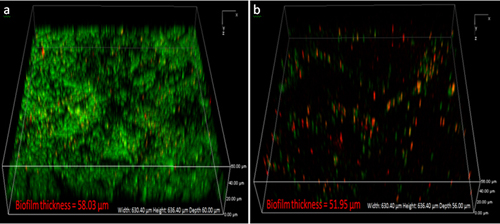 与铜绿假单胞菌共培养7天后的细菌生物膜活/死染色后的生物膜形貌,