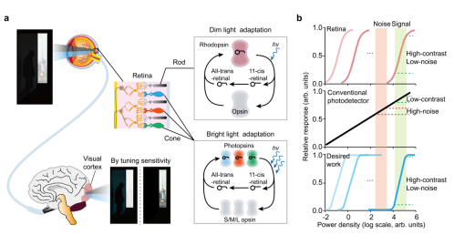图 1.仿生可调灵敏度光电探测器。a 人眼视网膜通过光适应机制在不同光照条件下实现高效视觉感知。视杆细胞和视锥细胞可根据环境光强动态调节自身灵敏度,从而在强光与弱光条件下均保持良好的感知能力。b 视网膜、传统光电探测器与仿生光电探测器的光响应特性对比。视网膜和仿生光电探测器能够突出目标与背景之间的相对光强差异,并有效抑制无关噪声;而传统光电探测器由于灵敏度固定、响应关系单一,难以对低对比度目标进行有效识别。