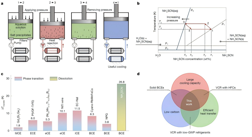 图1 : 溶解压卡效应的原理与特点。a. 制冷循环示意图;b. 溶液温度-浓度相图以及对应于图a的循环过程;c. 不同材料的换热流体温降数据对比;d. 溶解压卡效应与固体压卡效应及气体压缩制冷技术的优势对比。