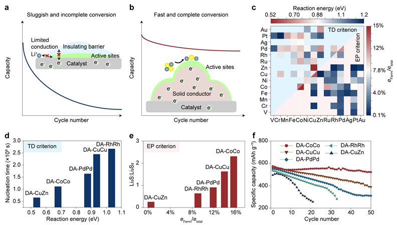 该研究以具有明确空间构型和可调电子结构的双原子催化材料为模型体系,对351种催化材料开展了密度泛函理论计算优选和实验验证,解耦了热力学反应能垒与产物电子性质在催化固相转化反应中的作用规律:在反应初始阶段,催化材料的热力学反应能垒起主导作用,具有热力学优势的双原子催化材料可加速产物的成核动力学;但随着中间产物不断积累,反应不再由热力学因素主导,产物的电子性质成为决定整体催化性能的关键因素。该工作不仅为受绝缘固相转化限制的电化学体系确立了普适性设计原则,也为电催化反应设计开辟了新方向。