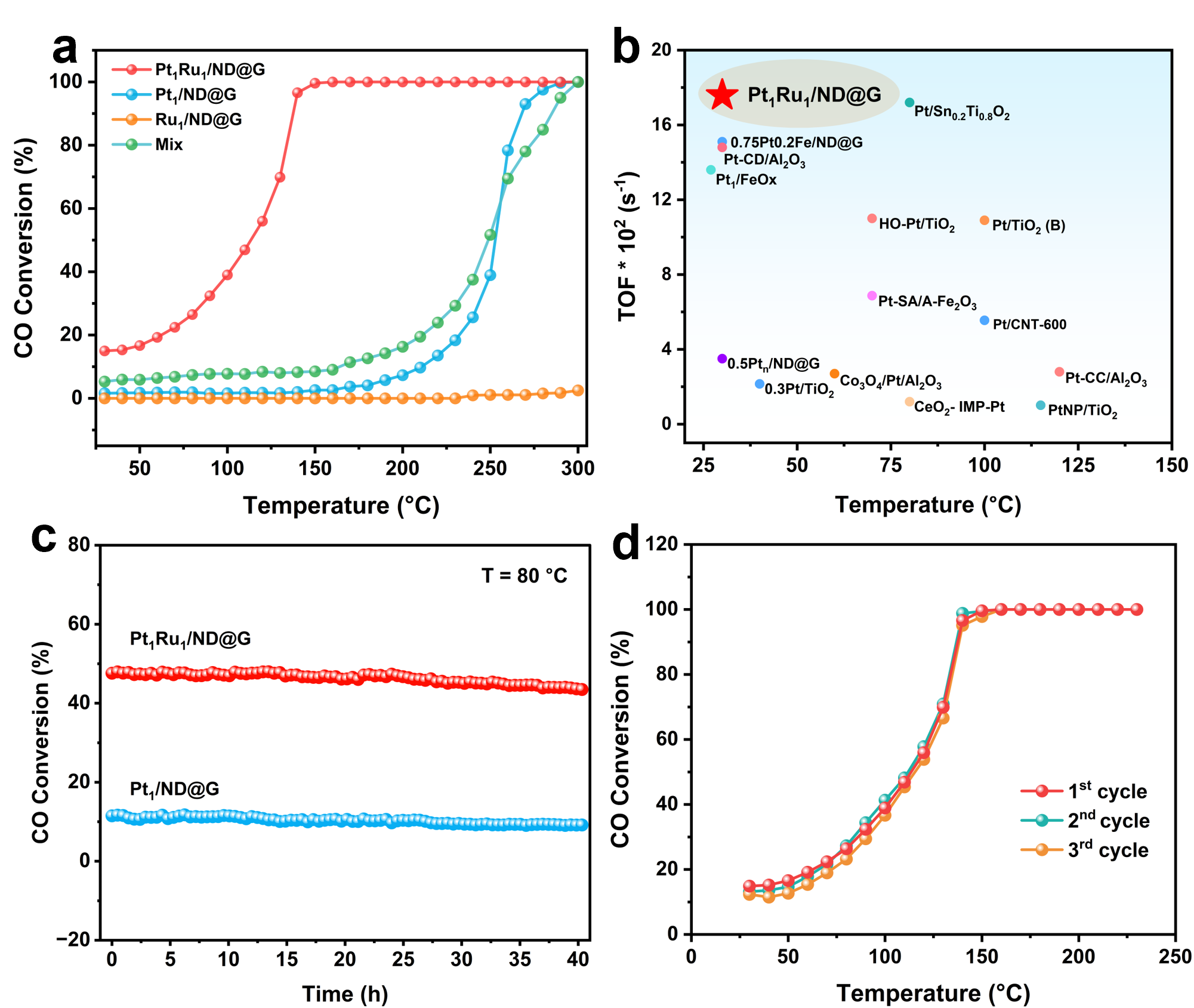 图2. CO催化氧化性能。(a)反应活性,(b)Pt基催化剂性能对比,(c)长时间稳定性,(d)循环稳定性。