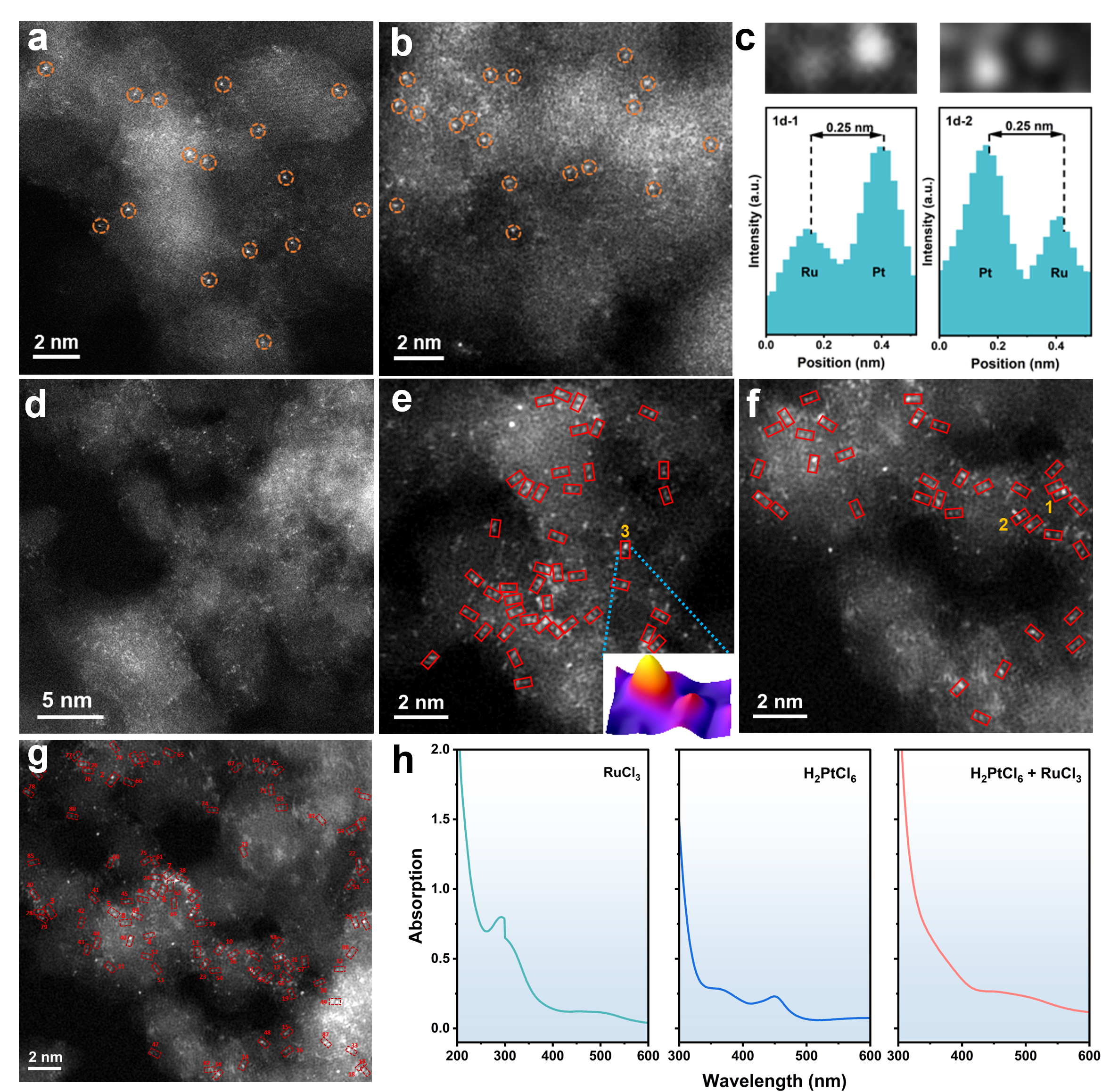 图1.催化剂结构表征。(a-b), (d-f)HAADF-STEM图像,(c)线性强度分析,(g)原子间距统计,(h) 紫外可见光谱。