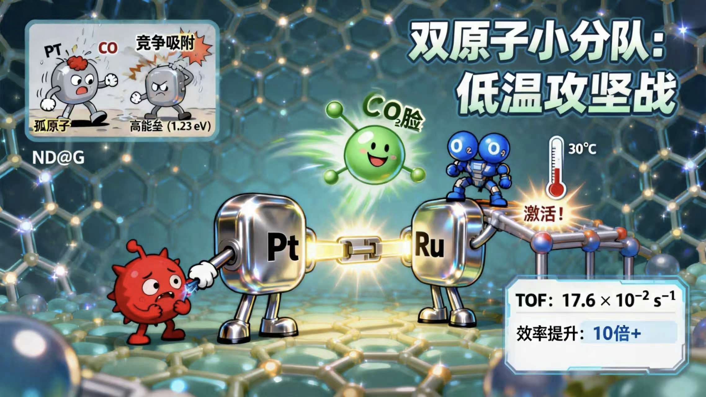 过去,我们依赖铂(Pt)、钯(Pd)等贵金属做催化剂,它们就像身价高昂的“超级英雄”,能独自活化CO和氧气(O₂)。但英雄成本太高,且容易“忙不过来”——CO和O₂在同一个位点上竞争,反而降低了效率。