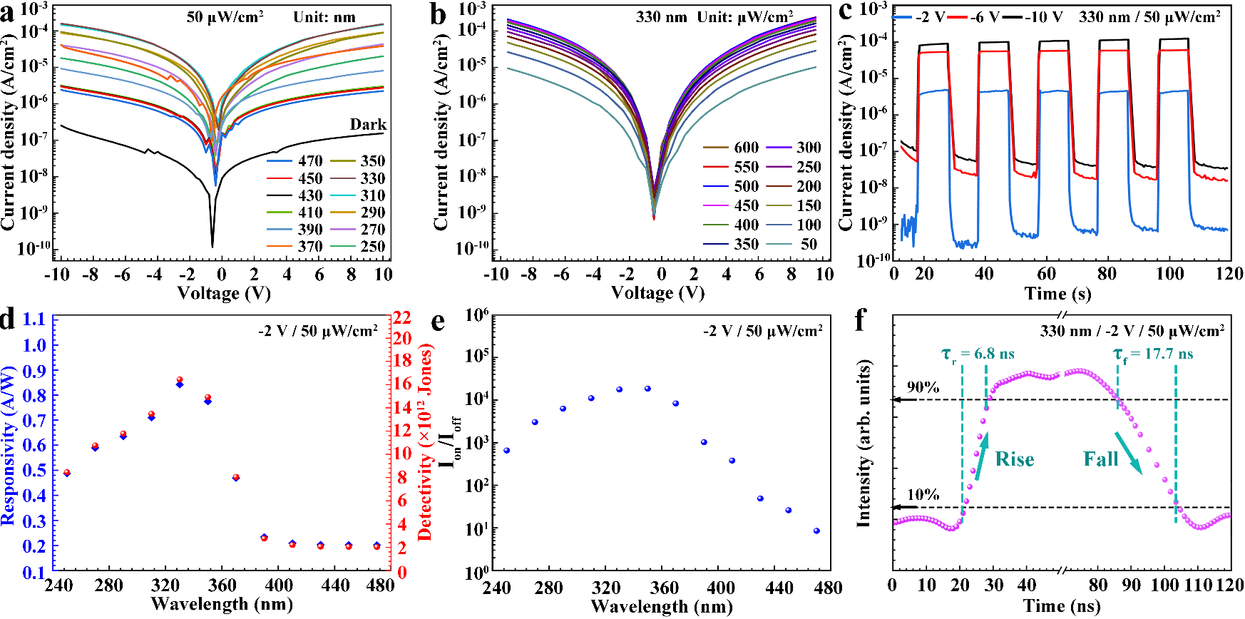 图5、SATO薄膜的光电性能。(a-c)不同波长、光强和偏压的光电响应曲线。SATO薄膜对330 nm紫外光响应最强,并具有优异的弱光探测能力。(d, e)不同波长下响应度、探测率和开关比性能。SATO薄膜表现出优异的光电综合性能。(f)瞬态光响应曲线。SATO薄膜具有纳秒级超快的响应速度。