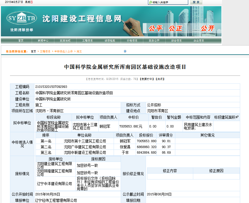 中国科学院金属研究所浑南园区基础设施改造项目中标候选人公示