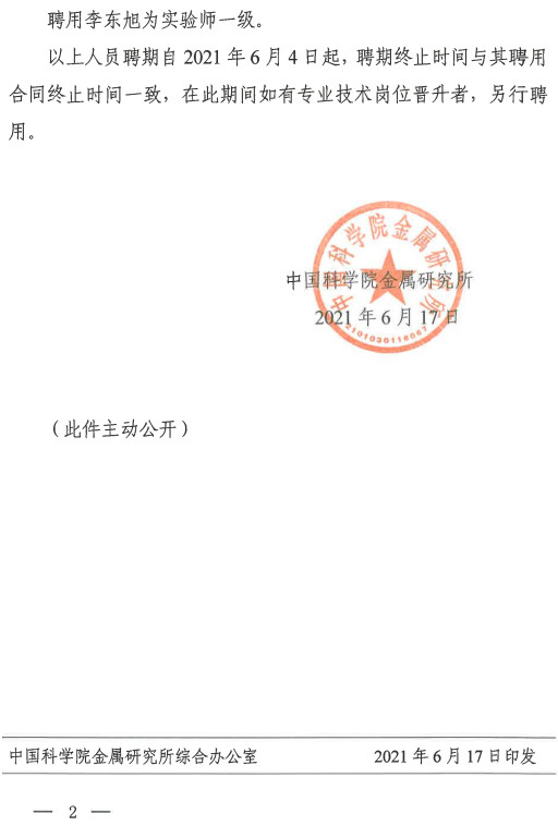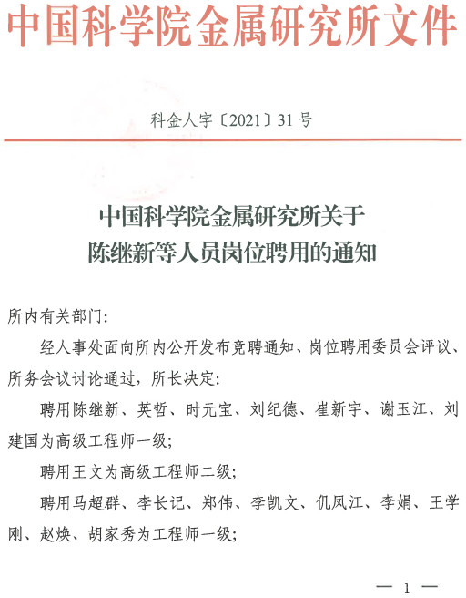 中国科学院金属研究所关于陈继新等人员岗位聘用的通知(科金人字〔2021〕31号)