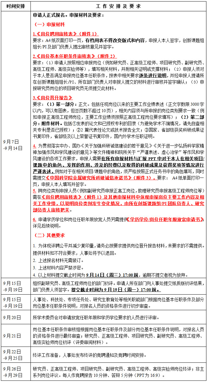 各部门申报副研究员或高级工程师岗位人数在2人(含)以上的,部门须开展初评,分别给出本部门申报副研究员岗位和高级工程师岗位的人员排序,并将初评结果上报人事处,供所高级专业技术岗位聘用委员会评议时参考。上报初评结果的截止时间为9月19日(周一)17:00前。