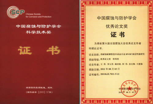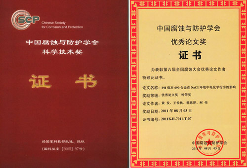另外,会议期间还举行了中国腐蚀与防护学会优秀论文奖的颁奖仪式。中国腐蚀与防护学会优秀论文奖是中国腐蚀与防护学会科学技术奖中的一个奖项。2005年中国腐蚀与防护学会在国家科学技术奖励工作办公室注册登记了科学技术奖(国科奖字[2005]97号文,登记证书编号:国科奖社证字第0138号),下设科技发明奖、科技进步奖、优秀论文奖和国际科学技术合作奖等4个奖项。自2007年启动科技进步奖以来,本次是首次启动优秀论文奖。本次大会共收到学术论文摘要350余篇,论文全文280余篇,经同行专家认真筛选和评审,评选出优秀论文45篇,其中特等奖15篇,一等奖30篇。其中,我所6篇论文榜上有名,3篇论文获优秀论文特等奖,3篇论文获优秀论文一等奖。