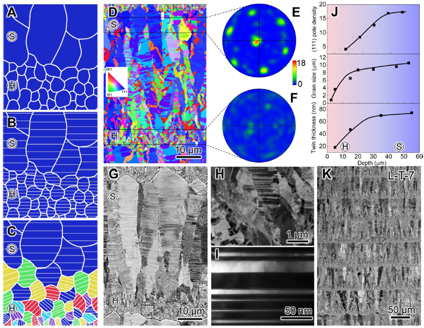图1 三基元梯度纳米孪晶(L-T)Cu的微观结构。具有单一晶粒尺寸梯度(A)、晶粒尺寸和孪晶片层厚度双基元梯度(B)以及包含织构梯度在内的三基元梯度(C)的层状结构示意图,均由硬(Ⓗ)和软(Ⓢ)基元组成,分别简称为L-S、L-D和L-T。L-T Cu中一层的EBSD图像(D)和SEM图像(G)以及该层起始位置(F)和结束位置(E)的(111)极图。该层起始位置(G中黑框所示)的高倍SEM图像(H)和TEM图像(I)。(J)(111)极密度、晶粒尺寸和孪晶片层厚度随距界面深度的演变规律。(K)具有7层三梯度的L-T-7样品的横截面SEM图像。