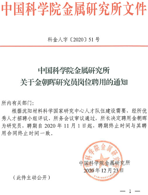 中国科学院金属研究所关于金朝晖研究员岗位聘用的通知(科金人字〔2020〕51号)