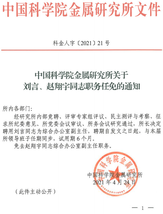 中国科学院金属研究所关于刘言、赵翔宇同志职务任免的通知(科金人字〔2021〕21号)