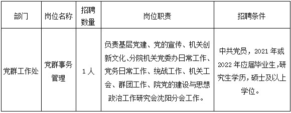 中国科学院沈阳分院是中国科学院的派出机构,属于事业单位,负责联络和协调中国科学院在辽宁省和山东省的研究所。本着“按需设岗、公开招聘、竞争上岗、择优聘用”的原则,面向系统各单位招聘管理岗位工作人员,具体信息如下: